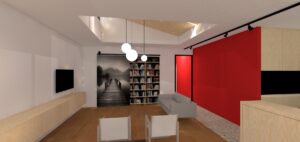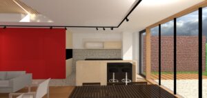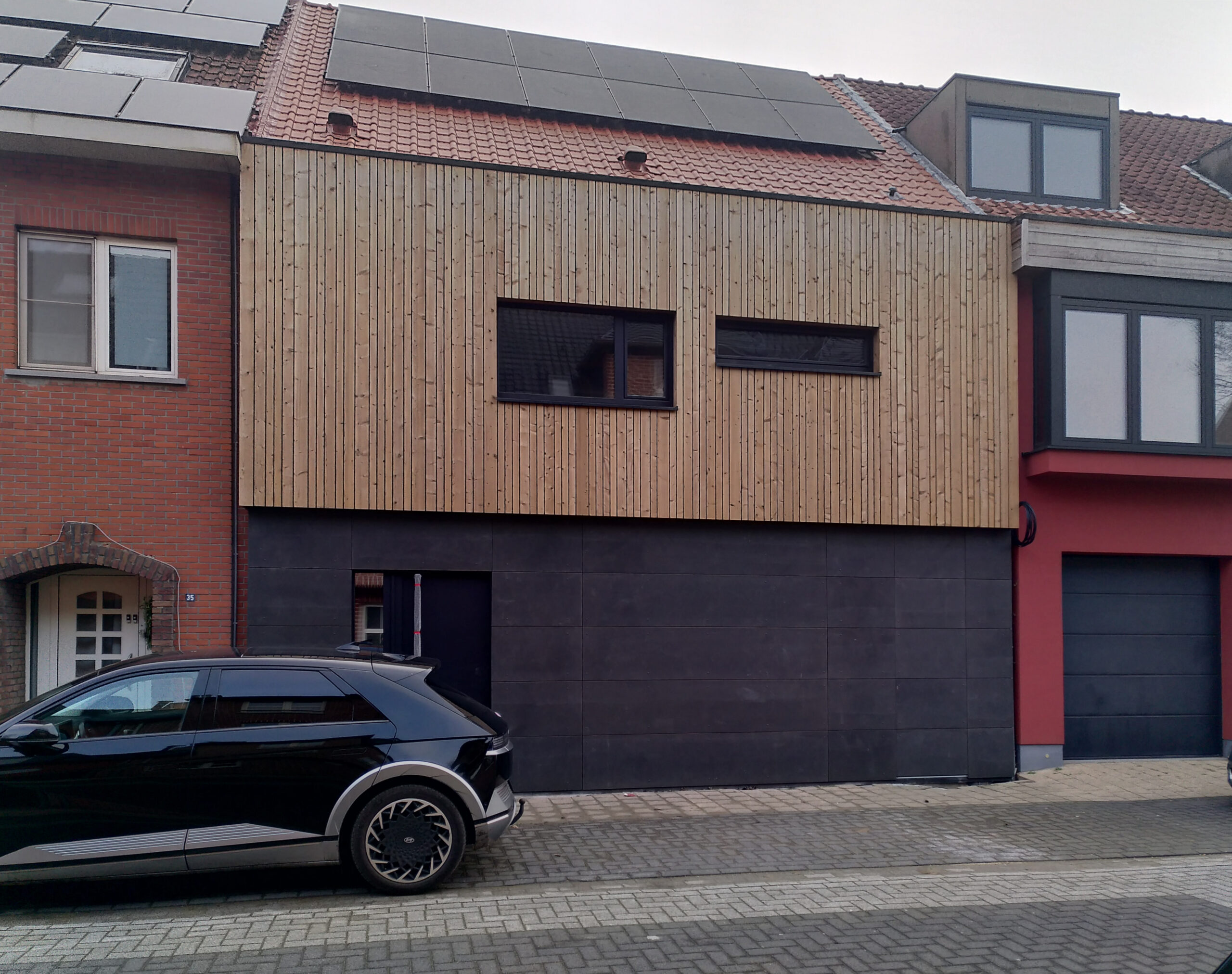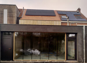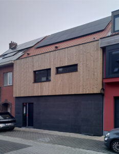 De achterbouwen van een bestaande rijwoning werden afgebroken en er is een nieuwe achterbouw opgericht over de volledige breedte. Er is een platdakverhoging gemaakt met raam op het zuiden om de winterzon binnen te trekken (en geen oververhittng te veroorzaken in de zomer). De zoldervloer onder het schuine dak is geisoleerd. Daken en zolders geisoleerd met papiercellulose, gevels zijn langs buiten geisoleerd met pur-platen. De vroegere leefruimte is gargage geworden, de leefruimte heeft contact met de grote achtertuin. Qua energiezuinige technieken o.a. voorzien van een warmtepomp, ook voor koeling geschikt. Alsook een balansventilatie met warmterecuperatie en op het dak pv panelen. Project in uitvoering